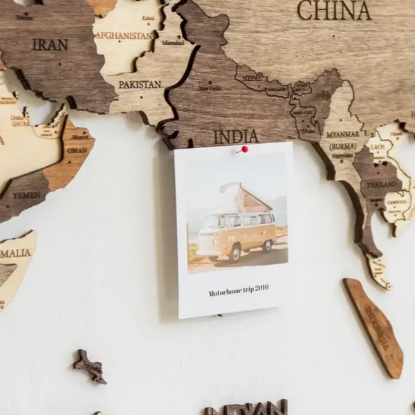 El mapa 3D de Woody Map añadirá personalidad a tu pared. Usa los pinos verdes para marcar los destinos ya explorados y los rojos para los que aún no se han descubierto. Los diferentes tonos de madera natural de este mapa multicolor encajarán perfectamente en tu salón o dormitorio. No podrás dejar de buscar nuevos lugares para visitar. Disfruta montando el mapa con tus amigos o familiares. Mapa del mundo en relieve cortado a láser montado a mano con madera recuperada y contrachapado de abedul. - Hecho a mano con contrachapado de abedul natural - Tamaño: 150 x 90 cm - Mapamundi multicapa 3D (grosor 6 - 15 mm) - 4 colores diferentes de madera natural (el color del mapa puede variar según el tono de la madera) - Corte e impresión láser - Lista de países y capitales del mundo - Incluye 20 pinos verdes y 20 rojos - Incluye cinta adhesiva de doble cara para colgar sin taladrar agujeros en la pared